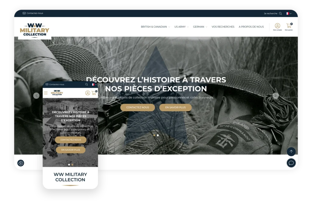 Le design, sobre et immersif, plonge l’utilisateur dans l’univers de la Seconde Guerre mondiale, tandis que l’optimisation SEO et les performances (responsive, balises ALT, meta descriptions, SSL, images WebP, maillage interne) garantissent une visibilité accrue et une expérience fluide pour les collectionneurs et passionnés d’histoire militaire.